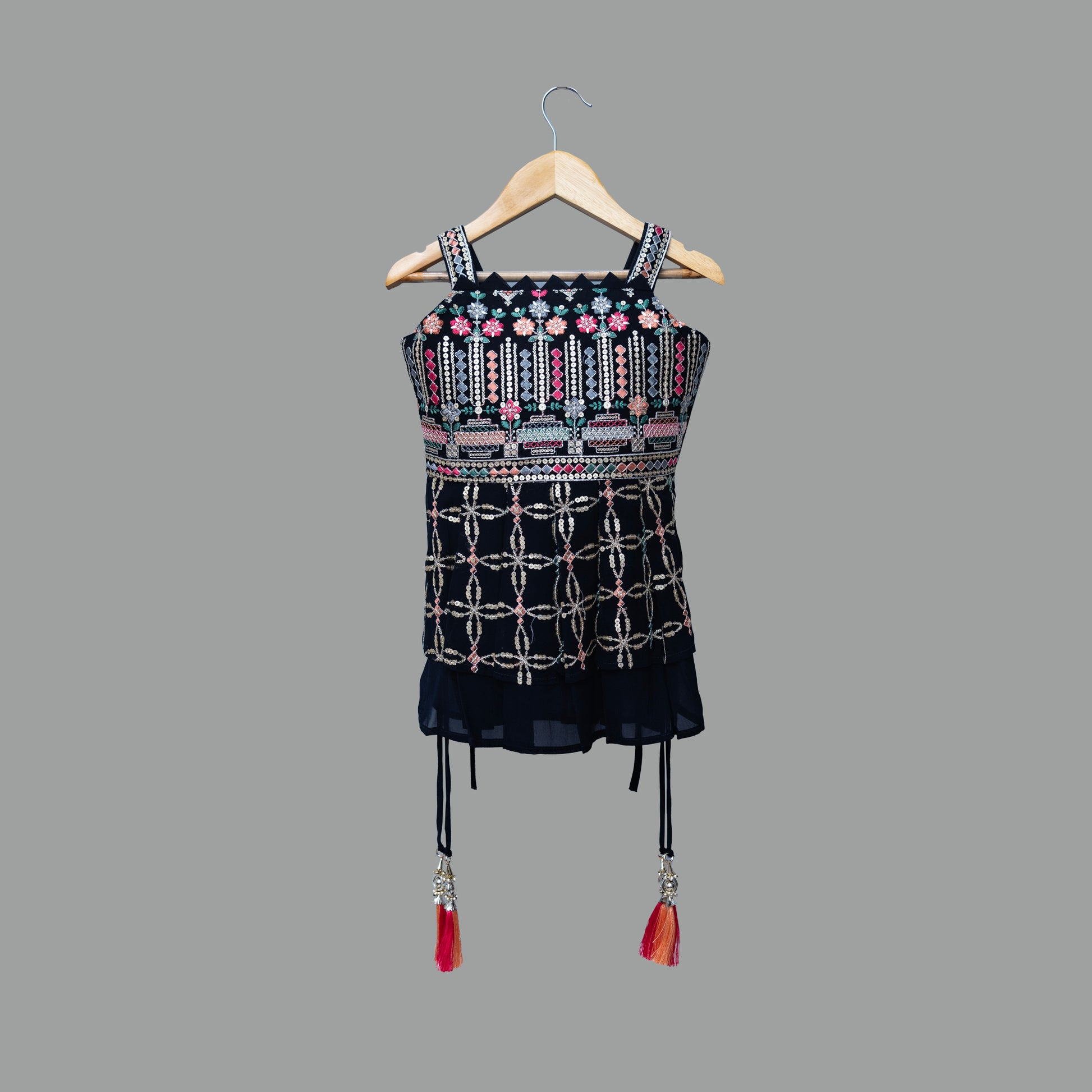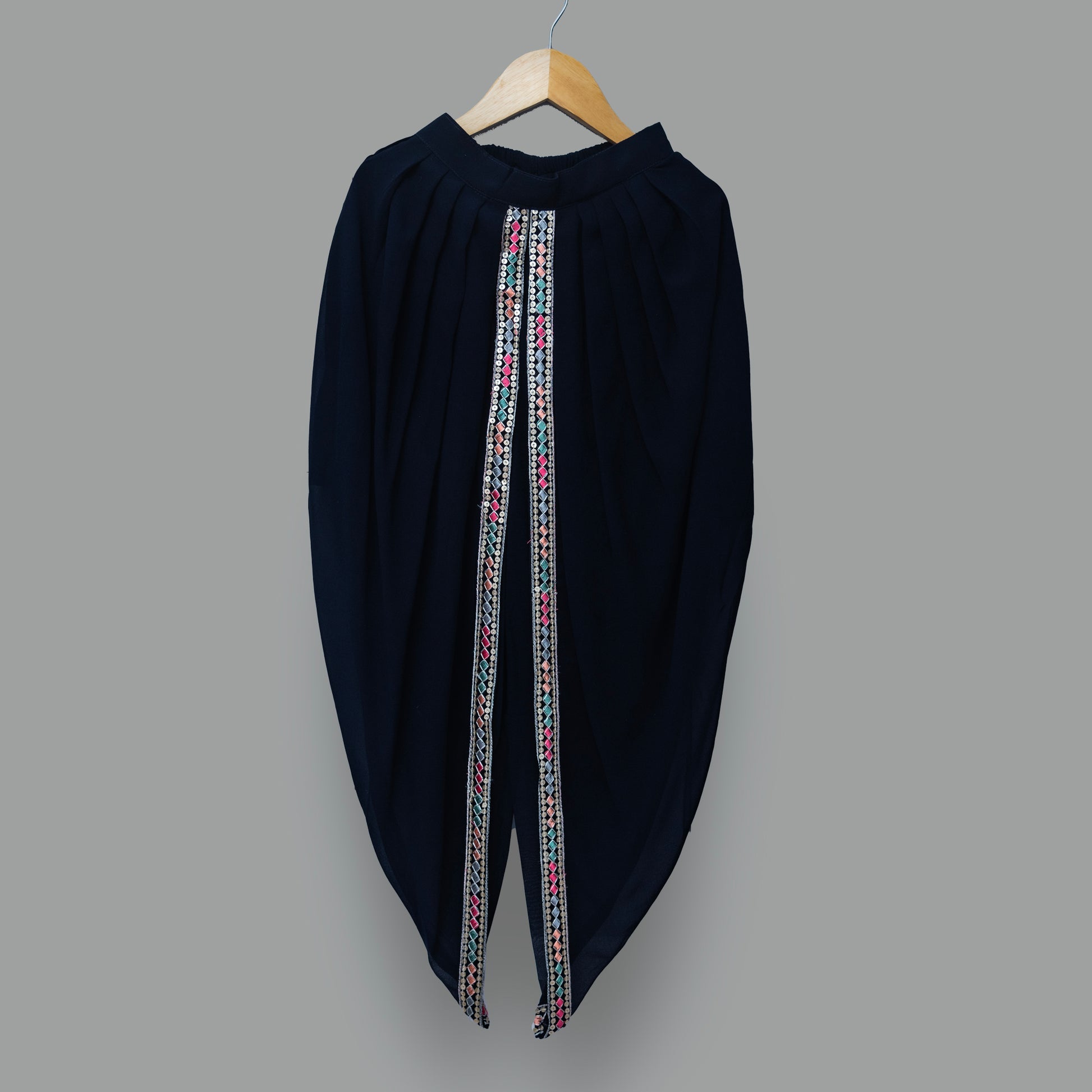 Dark blue girls dhoti set with beautiful sequin & embroidered detailed top and dhoti. This set includes a matching coverup and dupatta for a complete look.