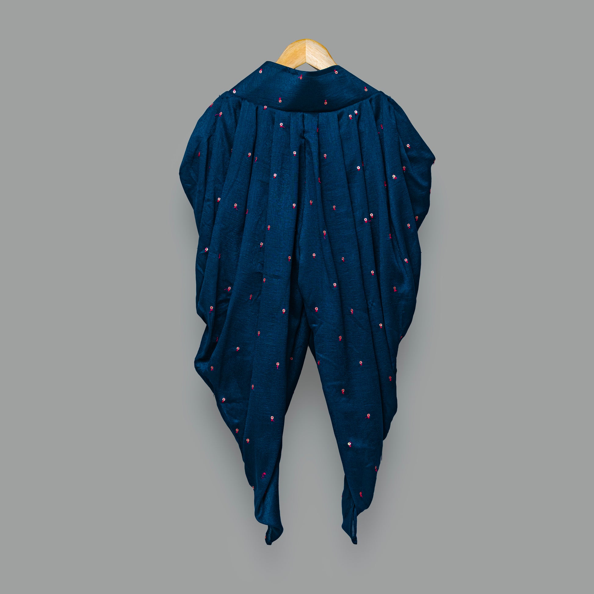 This stunning orange cyan dhoti suit features a beautiful traditional printed top made from soft georgette fabric and delicate handwork around neckline. The set includes a blue dhoti with delicate handwork and a matching dupatta for a complete look.
