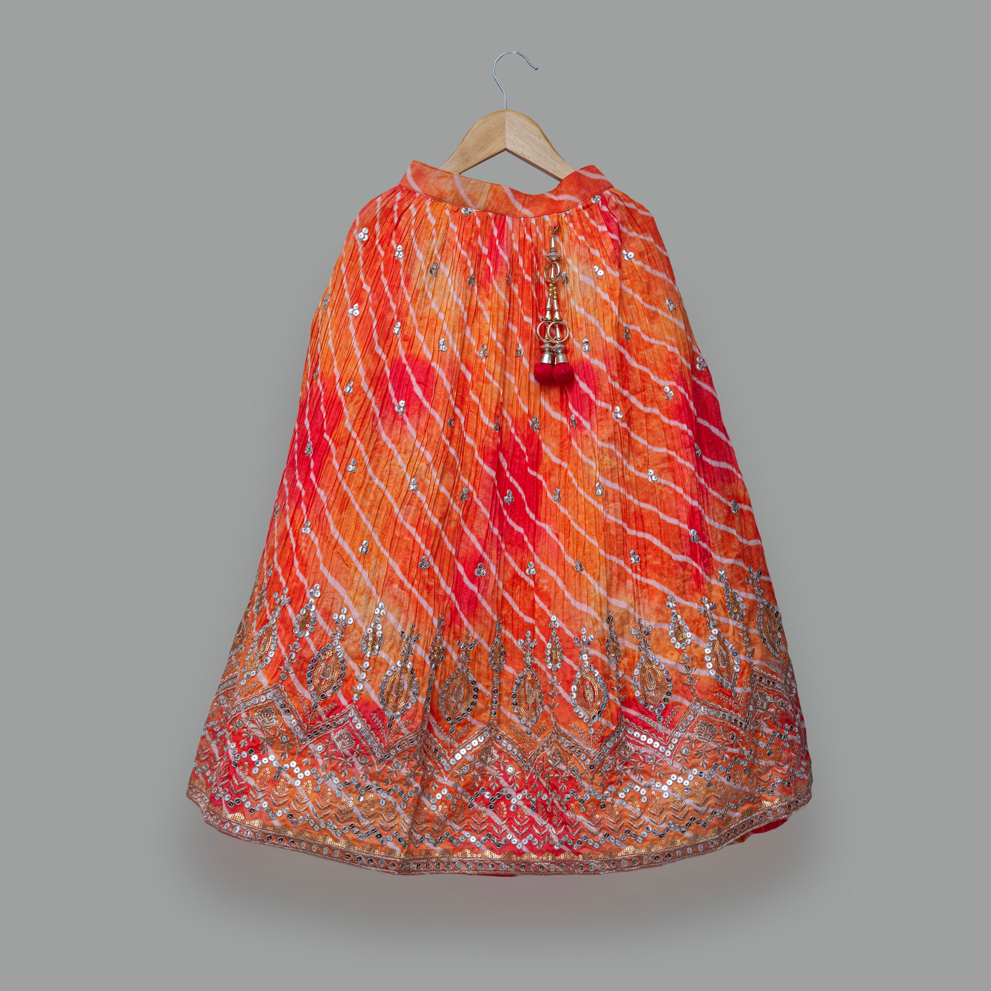 This beautiful lehenga choli set features a pink choli top and a stunning orange leheriya ghagra with delicate handwork and a matching dupatta for a complete look.