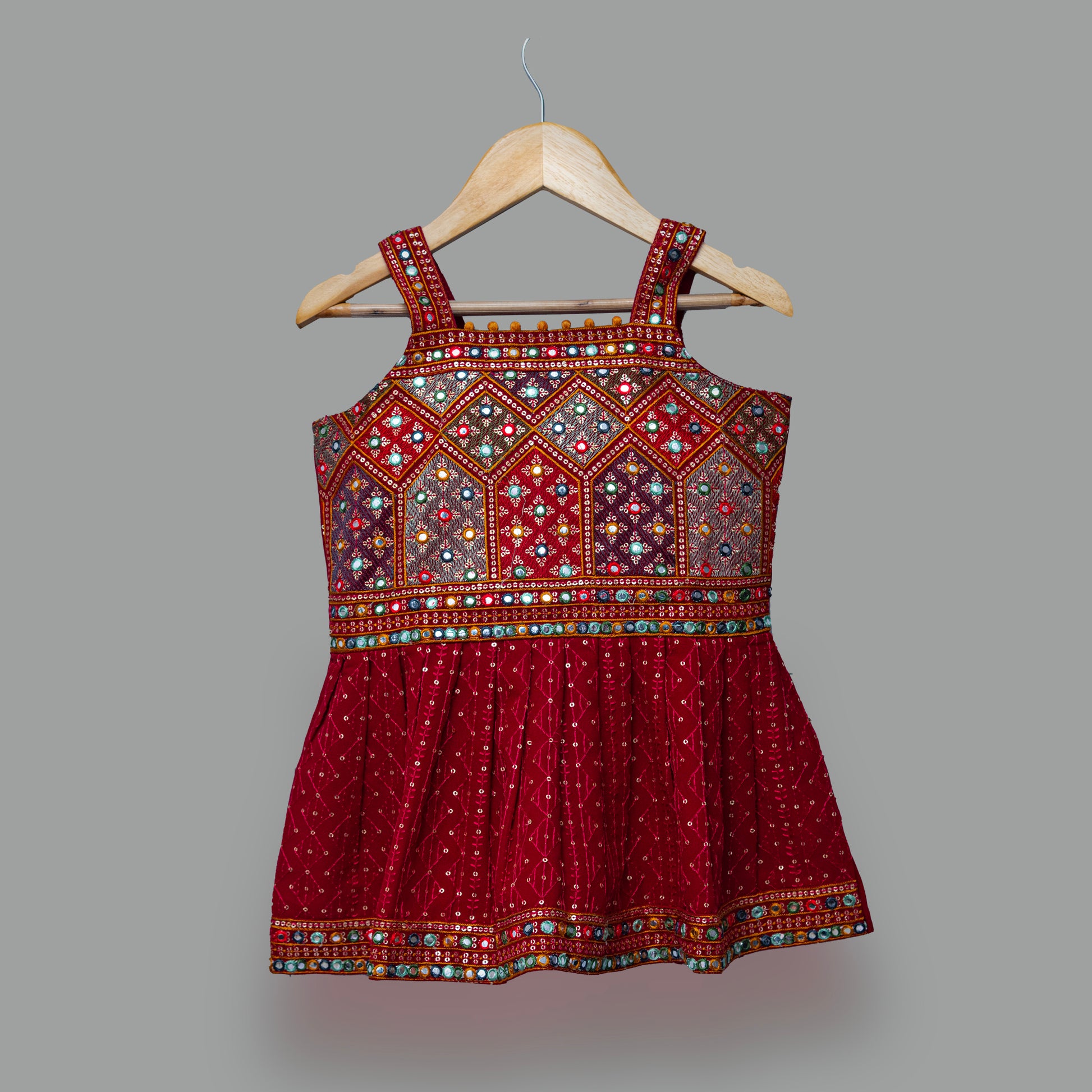 This red palazzo suit includes a stunning georgette top with intricate hand-embroidery, plain palazzo pants, matching dupatta and a cover-up.